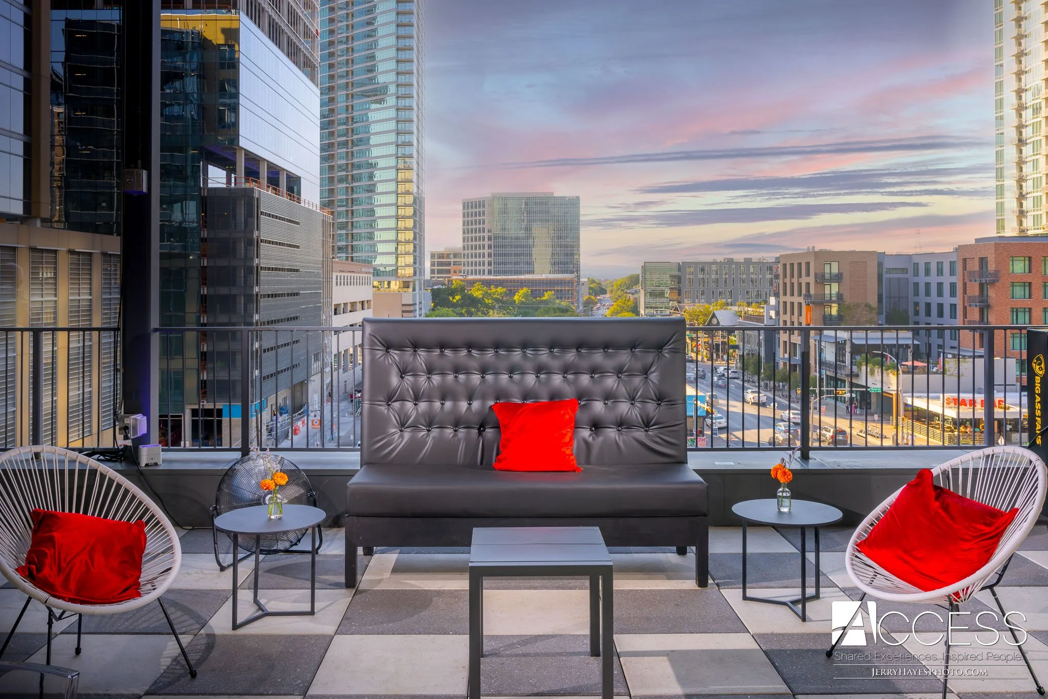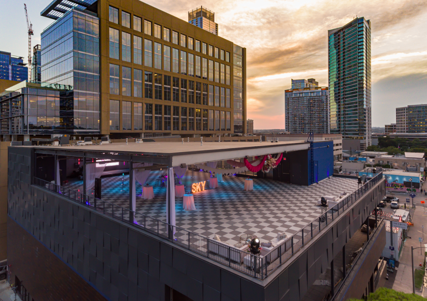 Our private event space is located on the roof of our building. Skybox is almost entirely covered with one closed side that hosts an entire stage and entrances to a green room and kitchen setup. The above-head roof houses heater units and a lighting system that can be programmed for different colors and effects. The biggest draw with Skybox is, of course, the view. You will have a nearly 360-degree view of Downtown Austin and West Austin in the distance.